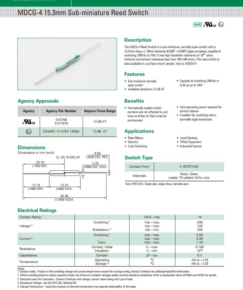 簡述: MDCG-4 系列 - 15.3mm磁簧開關(guān)|HAMLIN|干簧管